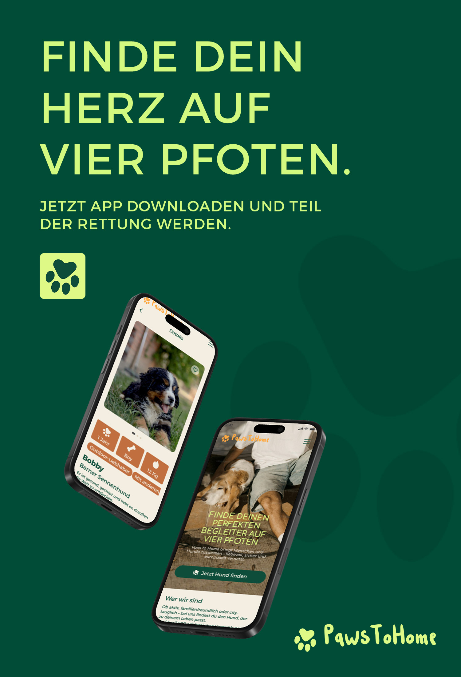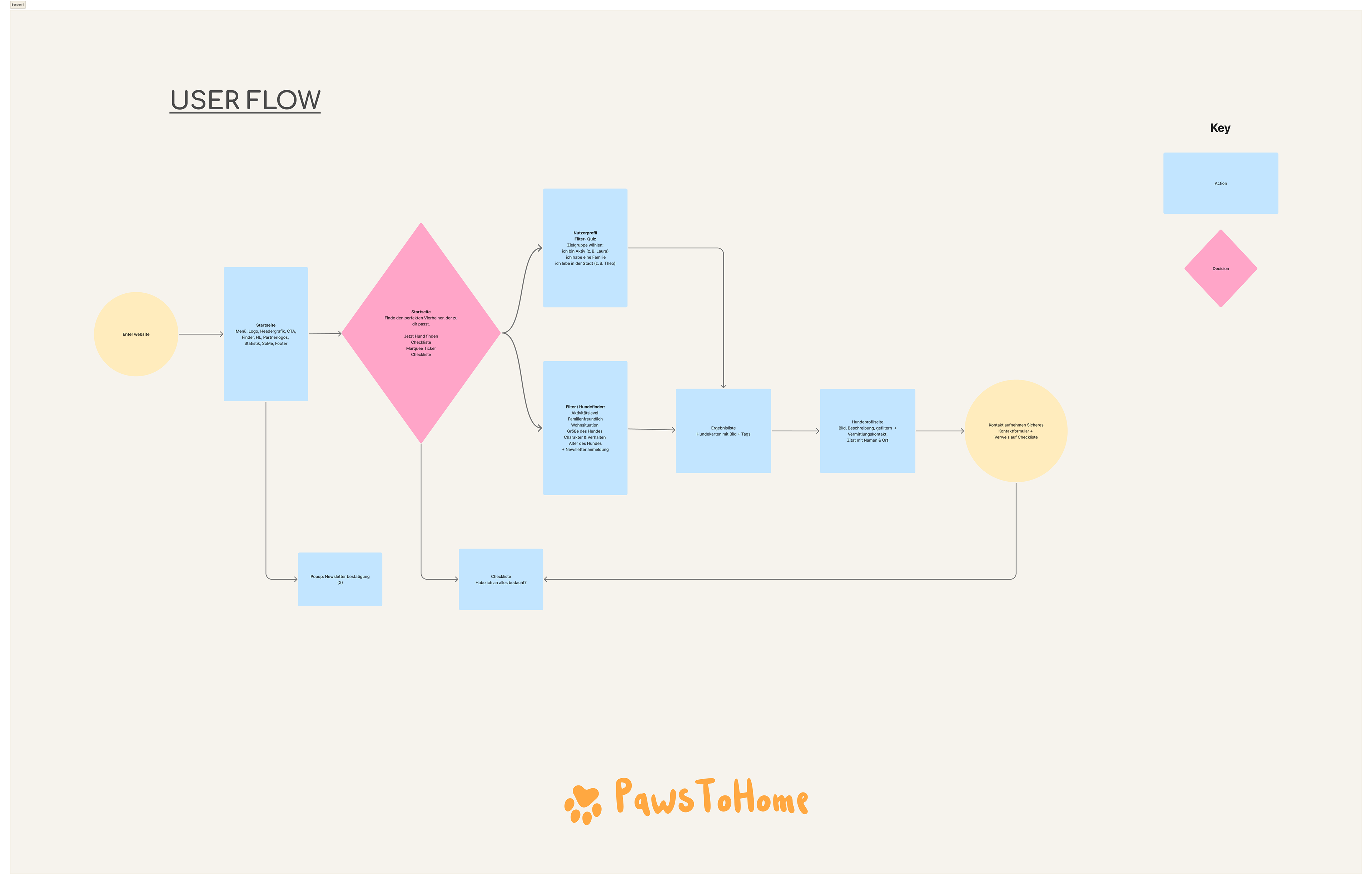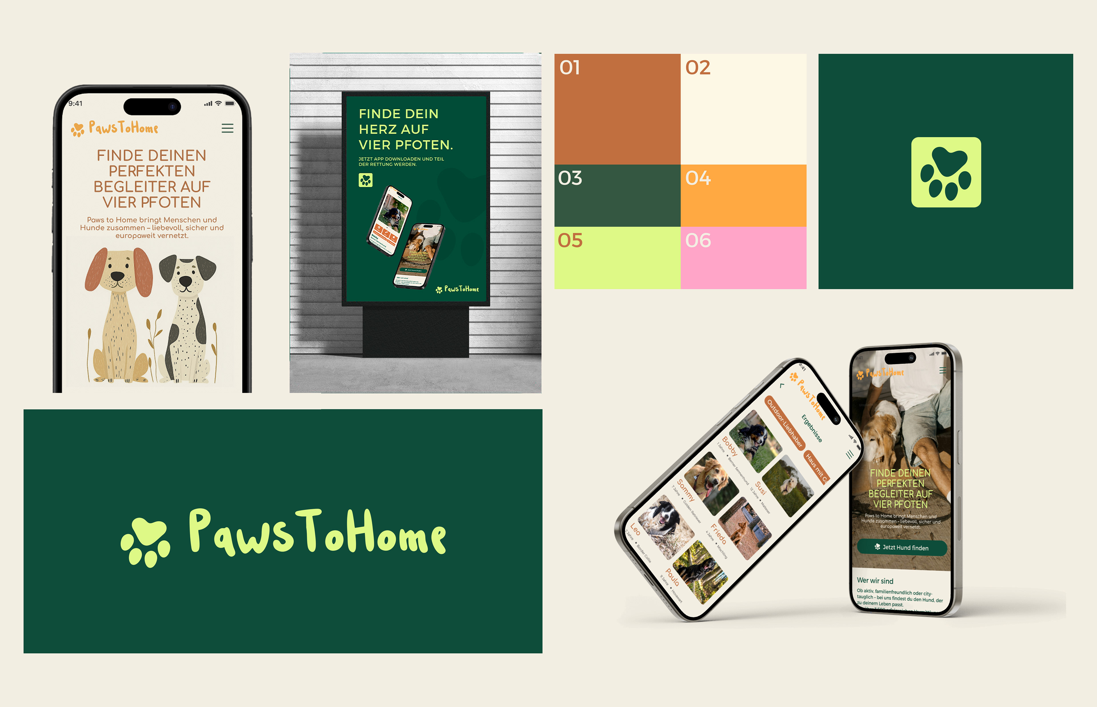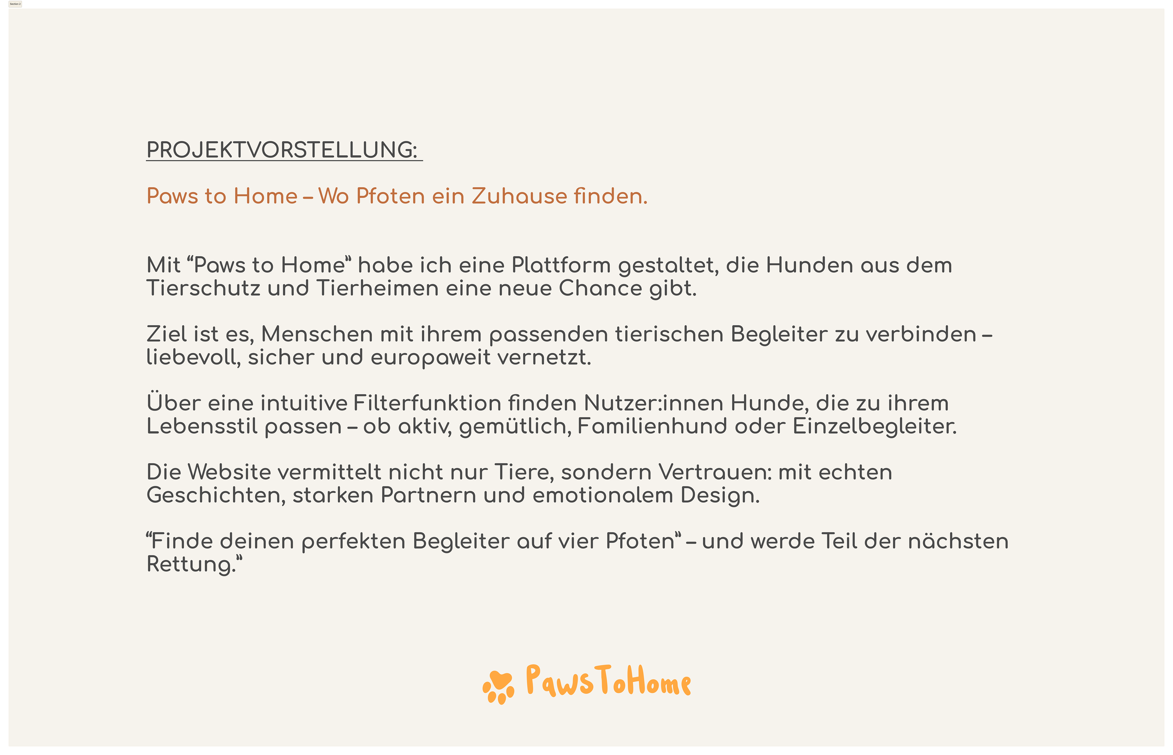 Client: Abschlussarbeit | cimdata Bildungsakademie Role: UI/UX Konzeption & Design FIGMA PROJEKT | WIREFRAMES | USER FLOW | UI DESIGN | MOBILE FIRST Konzeption und Gestaltung einer Vermittlungsplattform für Tierheimhunde mit Fokus auf Startseite und klarer Nutzerführung. In Figma entwickelte ich Wireframes, User Flow und ein reduziertes UI-System mit intuitiver Filterfunktion. Der Fokus lag auf einfacher Orientierung, emotionaler Ansprache und einer mobilen First-Umsetzung. Ergebnis ist eine strukturierte, skalierbare Plattform, die Nutzer:innen schnell zum passenden Hund führt.